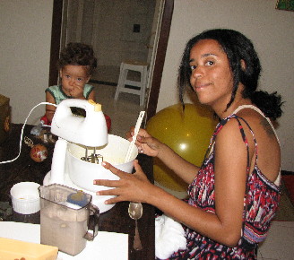 Hier ist es üblich ein Riesenfest zu machen weil das gleich nach der Geburt nicht möglich ist und nach einem Jahr die kritische Zeit vorbei ist, Charakterzüge sichtbar werden und der Erfolg der Mutter auch gefeirert werden muss! Es werden so grosszügig wie möglich Süssigkeiten aufgestellt und vorallem Kinder eingeladen. Ganz ohne Bier gehts nicht, aber wir haben es in eine Ecke verbannt. Die Fruchtsäfte konnte man mit Wodka angereichert haben. Dazu Pizza, Brötchen, Salzigkeiten,,, Dekorationen kann man mieten, aber unsere Freundin Helenita hat eigenes dazu beigetragen, und die Süssigkeiten sind auch zum teil bei uns gefertigt worden - eine turbolente Woche! Die Bilder der Vorbereitungen sind nur vom Vortag, während Daniela schon zwei Wochen vorher spiesse und Gitter bemalte und mit farbigen Zälti zu Blumen formte und Einladungen um einen Riesenlutscher faltete und verteilte...